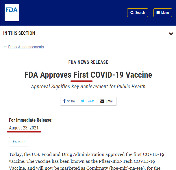 Notice how it explicitly says this is the first vaccine it has approved? And notice the date of the press release? August 23, 2021. So 3 days ago as of this writing, the FDA approved the first vaccine. Since the Reuters fact check was originally written on April 14, 2021, this means we know for sure that not a single COVID-19 vaccine had been FDA approved at the time Reuters did their fact check.
