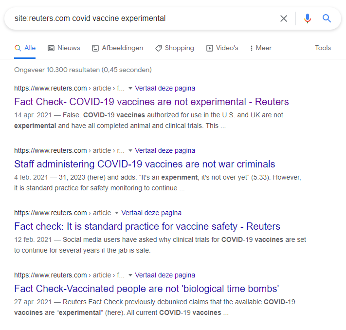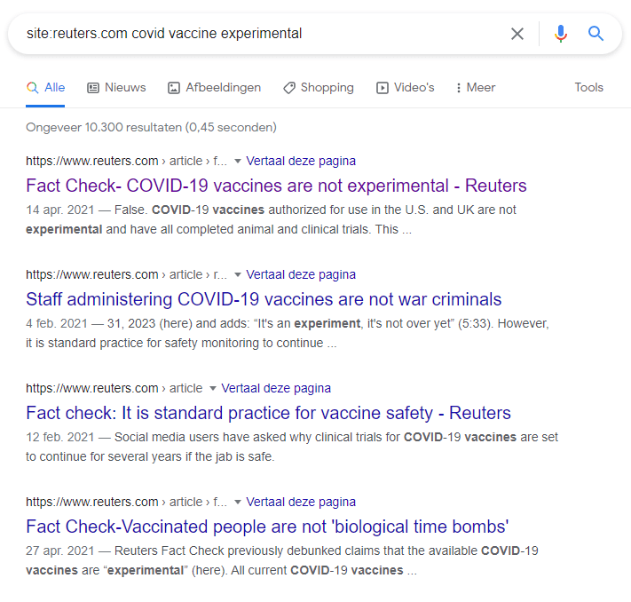 The first result is a fact check that Reuters did titled “Fact Check- COVID-19 vaccines are not experimental”