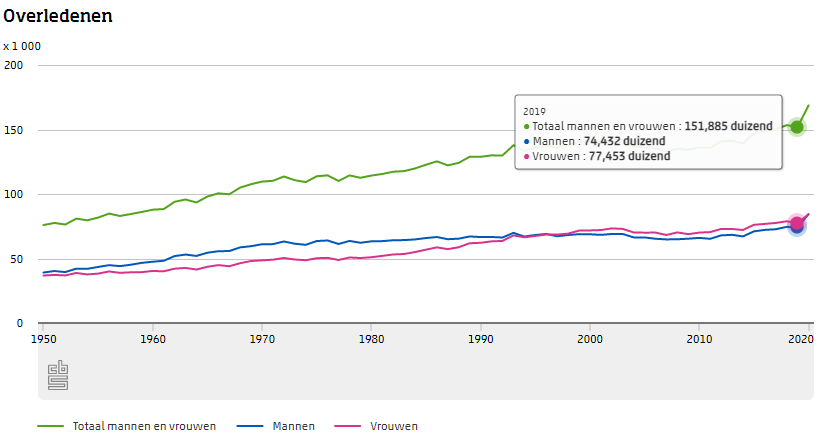 Deze keer, wat zijn eigenlijk normale cijfers voor sterfte? Laten we teruggaan naar het laatste jaar voor de komst van Corona, 2019, en kijken wat toen de normale, dagelijkse sterfte was. We vinden die gegevens eenvoudig op de website van het CBS: