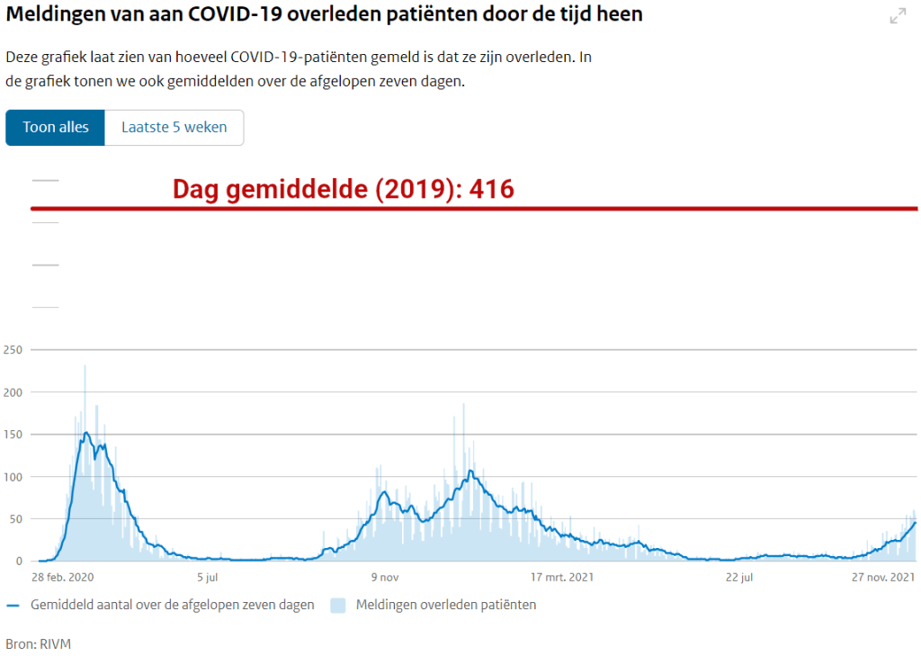 We zien dat Nederland in 2019 151.885 overledenen te betreuren had. Delen we dat door 365,25 om het dag gemiddelde te berekenen, komen we op +/- 416 overlijdens per dag. Laten we dat eens plotten op de grafiek van de sterftecijfers van het Corona dashboard: